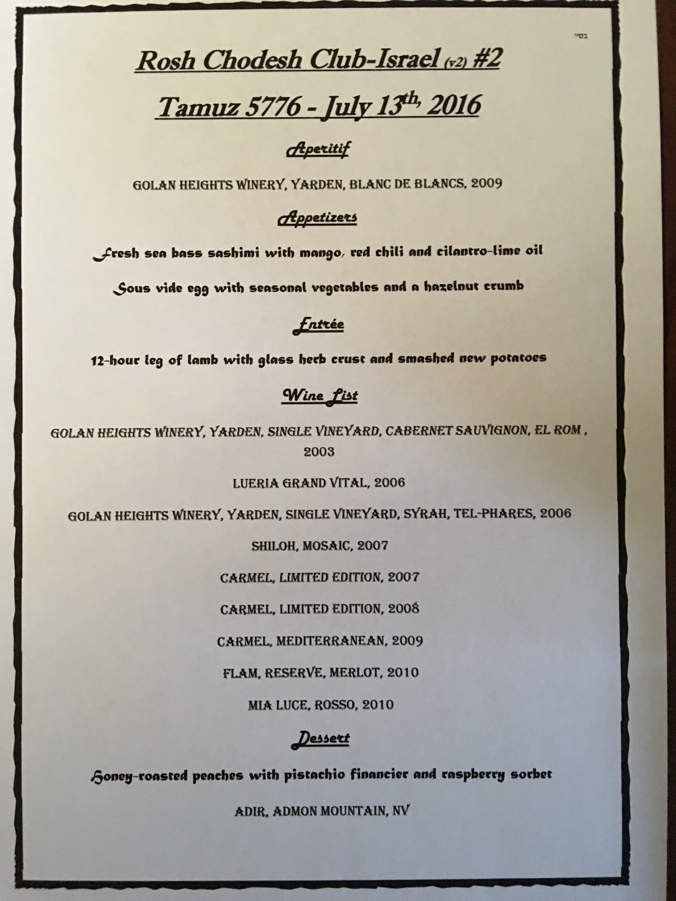 Our second RCC Israel for Tamuz 5776 was held on July 13th, 2016. We had one of my favorite entrees ever and besides the food being incredible – this time, EACH of the wines was either a total knockout or certainly interesting enough to warrant their appearance – what else can you ask for!