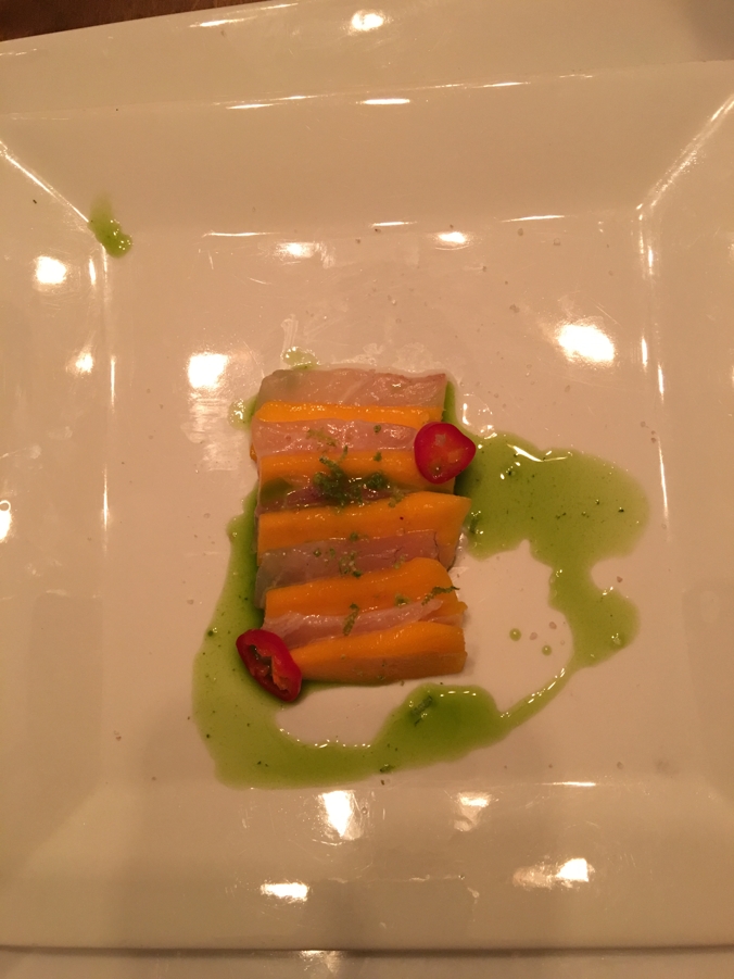 - Fresh sea bass sashimi with mango, red chili and cilantro-lime oil
