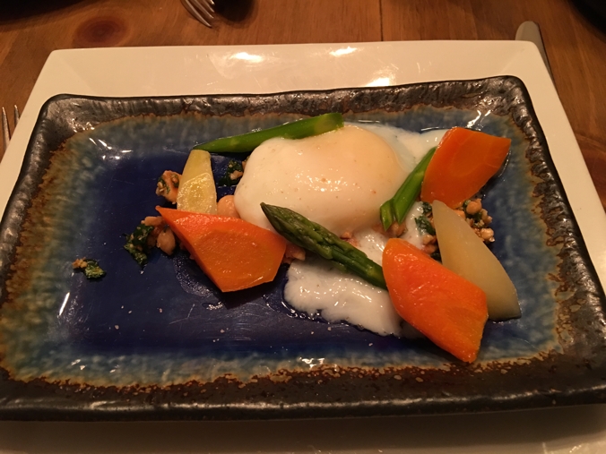 - Sous vide egg with seasonal vegetables and a hazelnut crumb