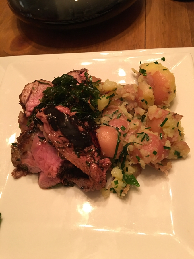 - 12-hour leg of lamb with glass herb crust and smashed new potatoes