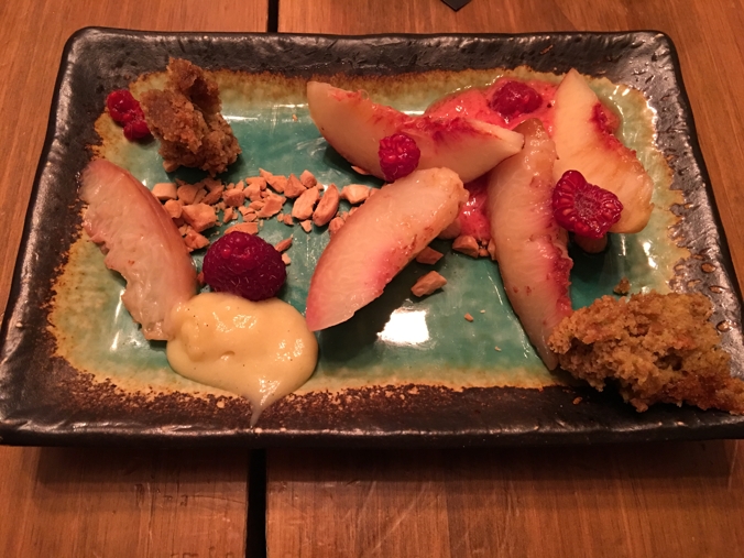 - Honey-roasted peaches with pistachio financier and raspberry sorbet