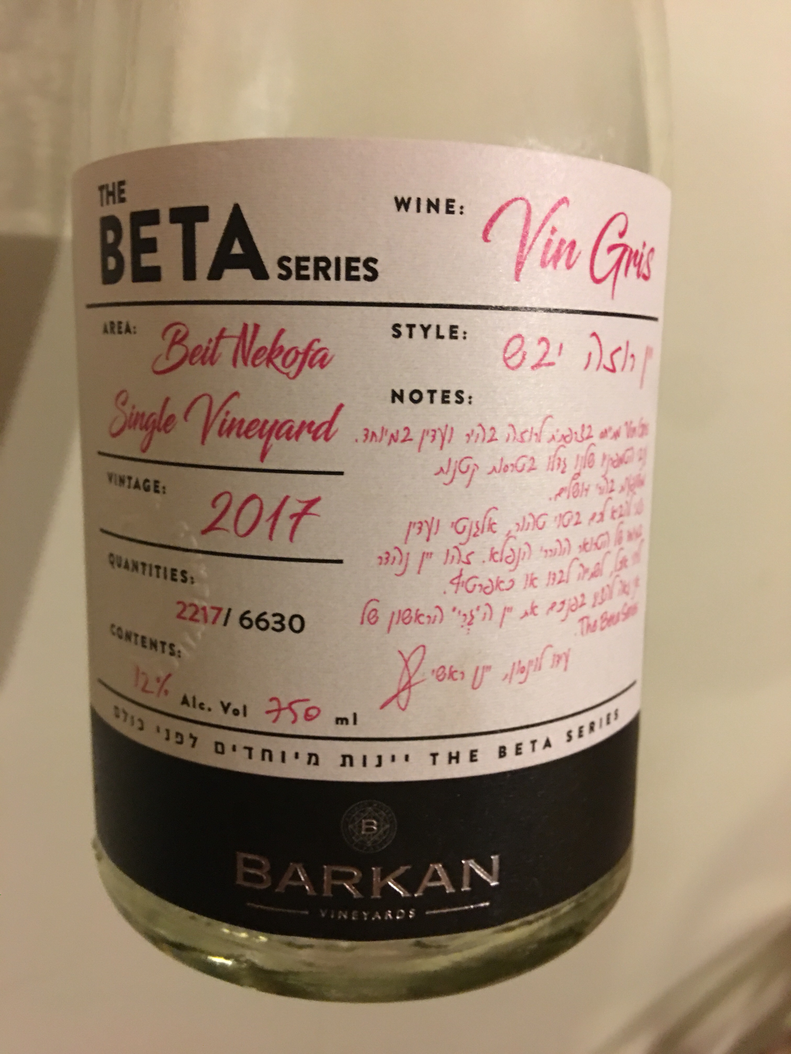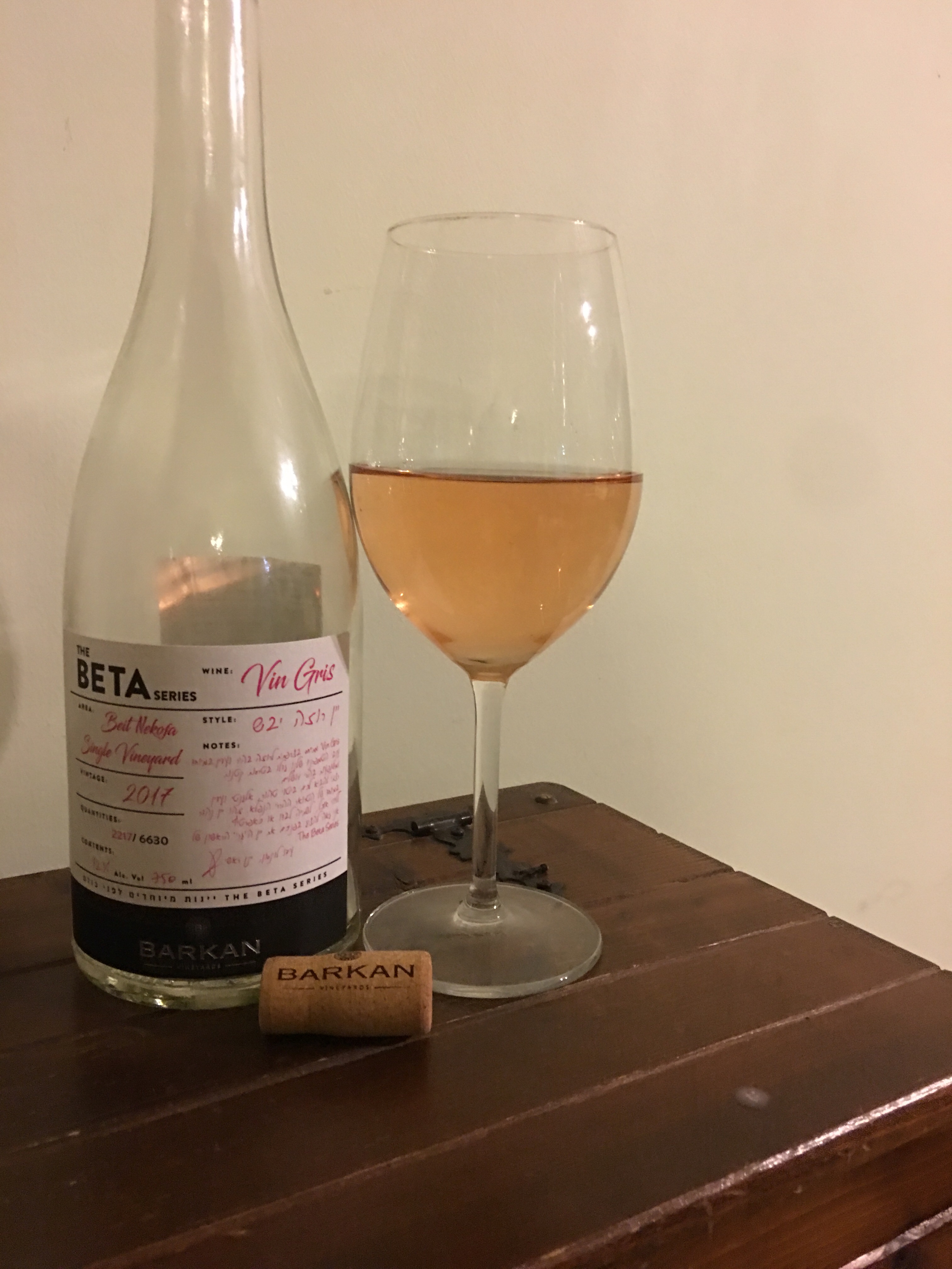 The 2017 Barkan Beta Series Vin Gris is made up of 100% Tempranillo – the second such Rosé this season, the first being the excellent Latour Netofa Rosado. The wine clocks in at 12% ABV. Like the Latour, the wine really changes with temperature – too cold and the nose and mouth are quite muted. But give it a chance to warm a couple of degrees above the regular Rosé serving temp and this wine opens up nicely. The nose is raspberry with a touch of flintiness.